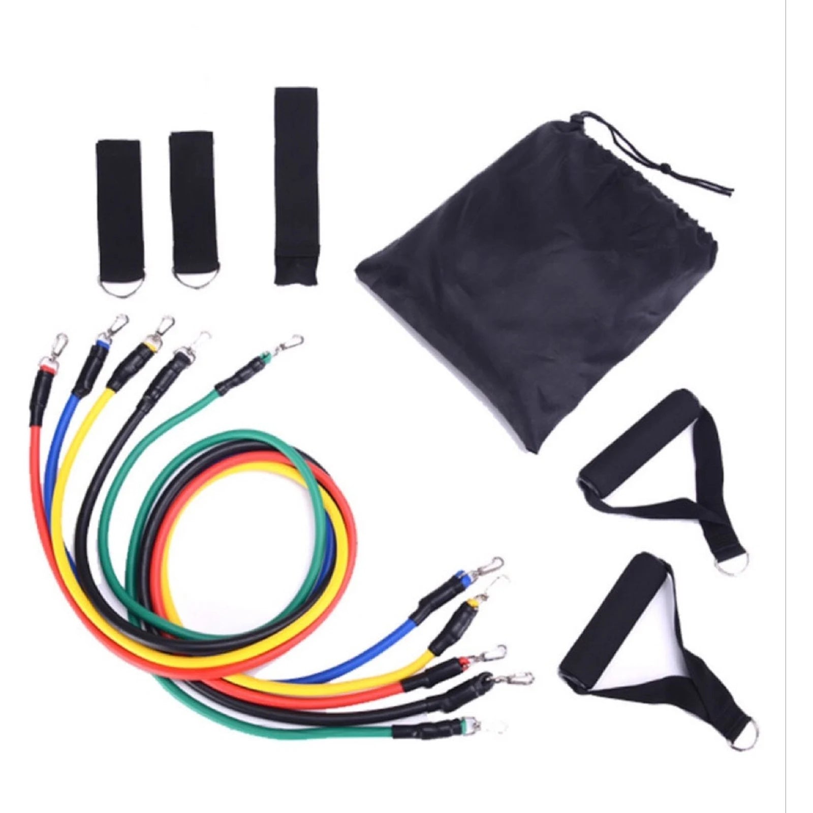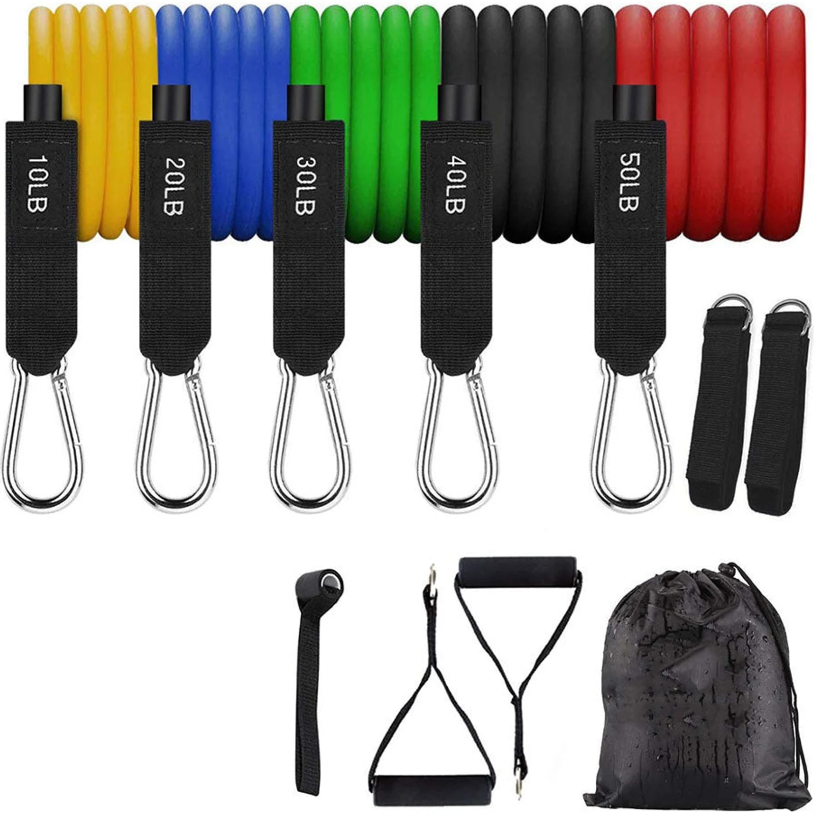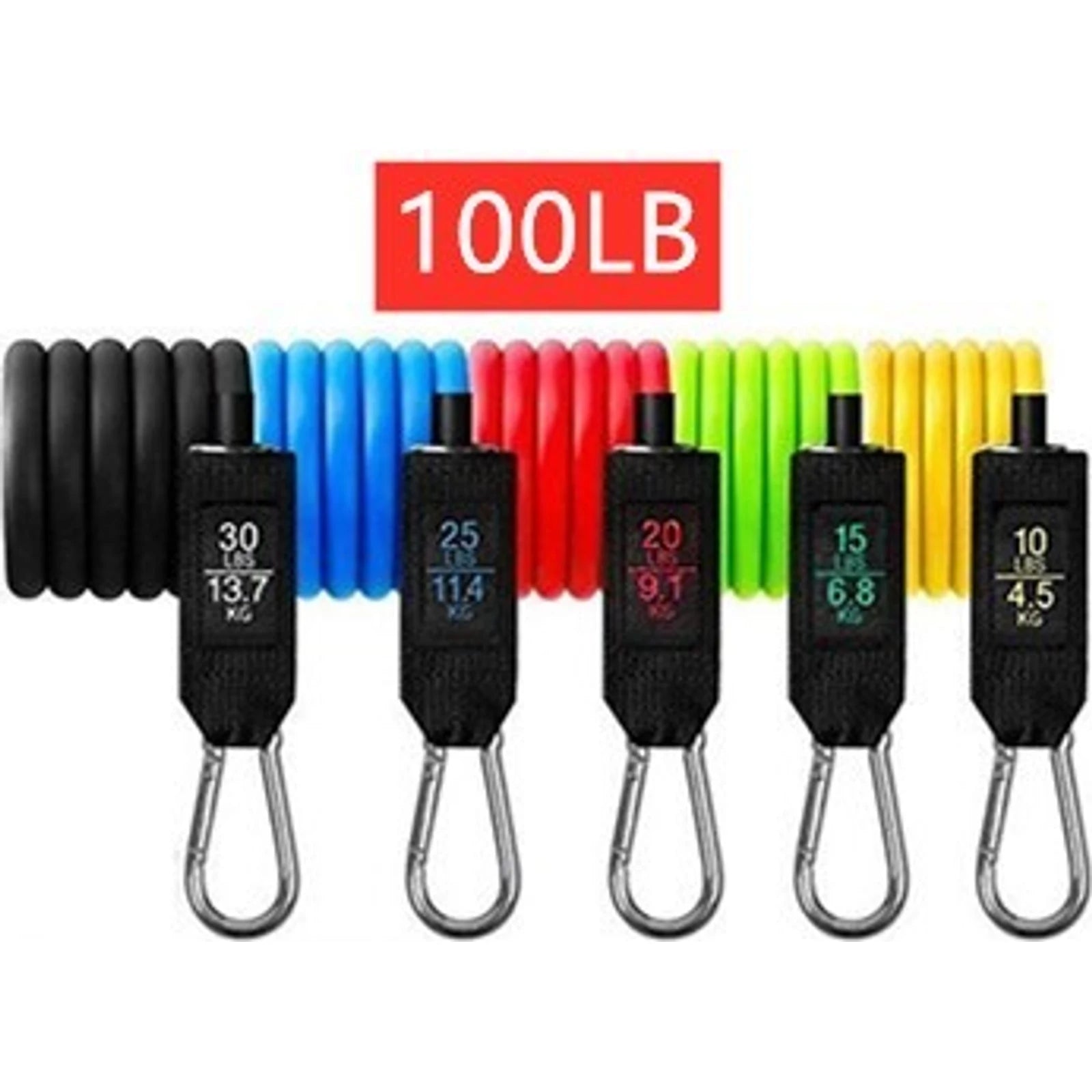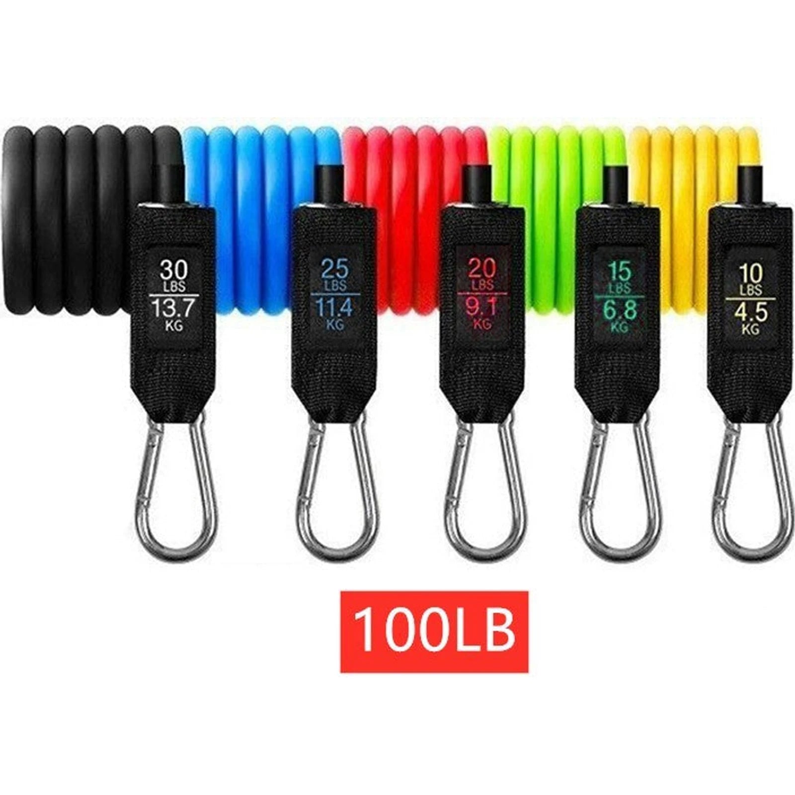 5 * elastic bands: black (30 lbs), blue (25 lbs), red (20 lbs), green (15 lbs), yellow (10 lbs)