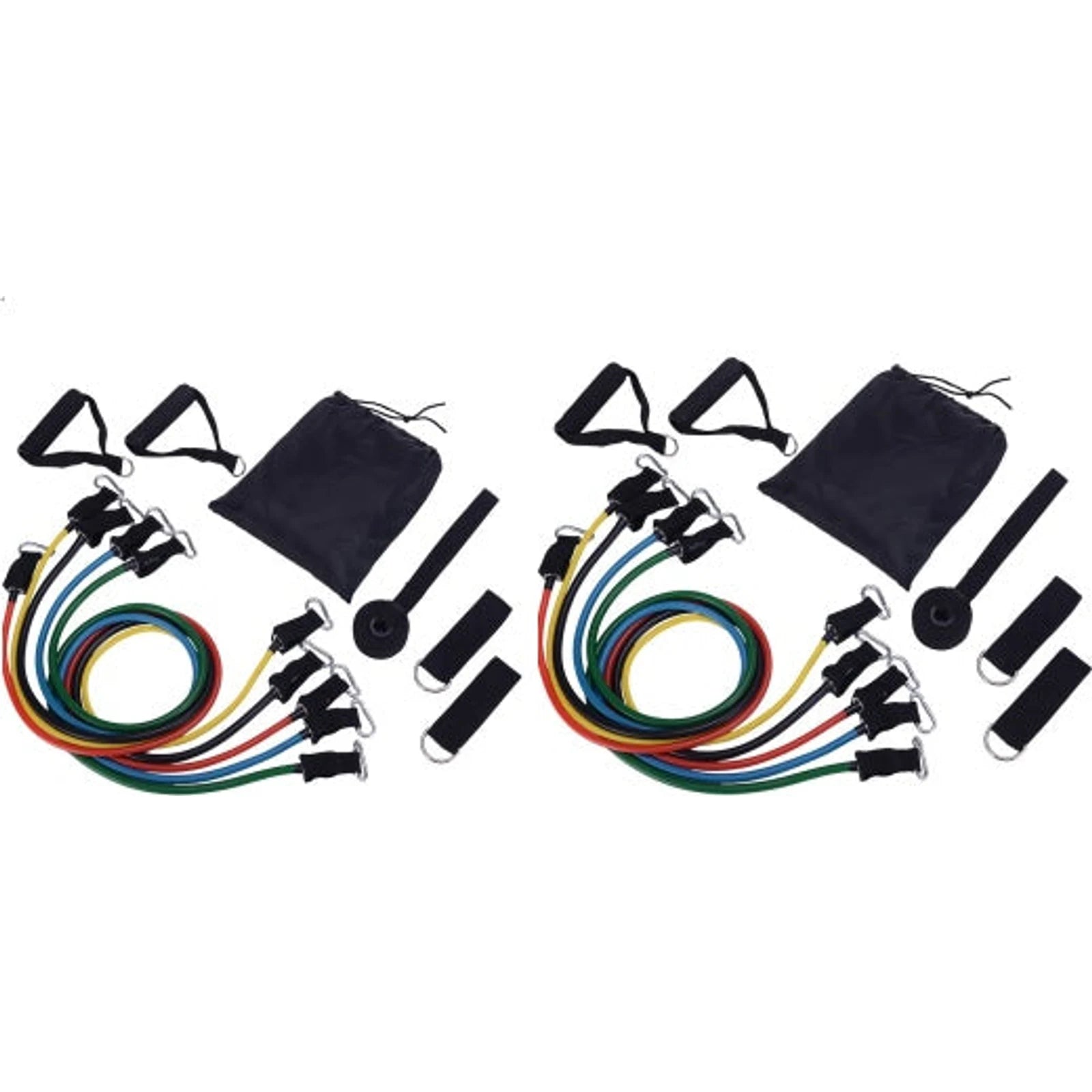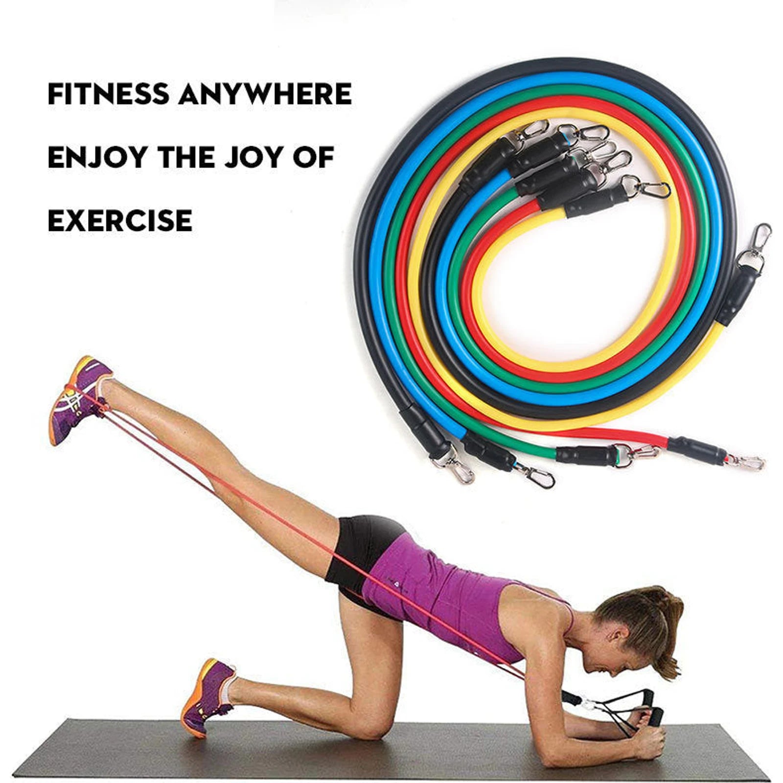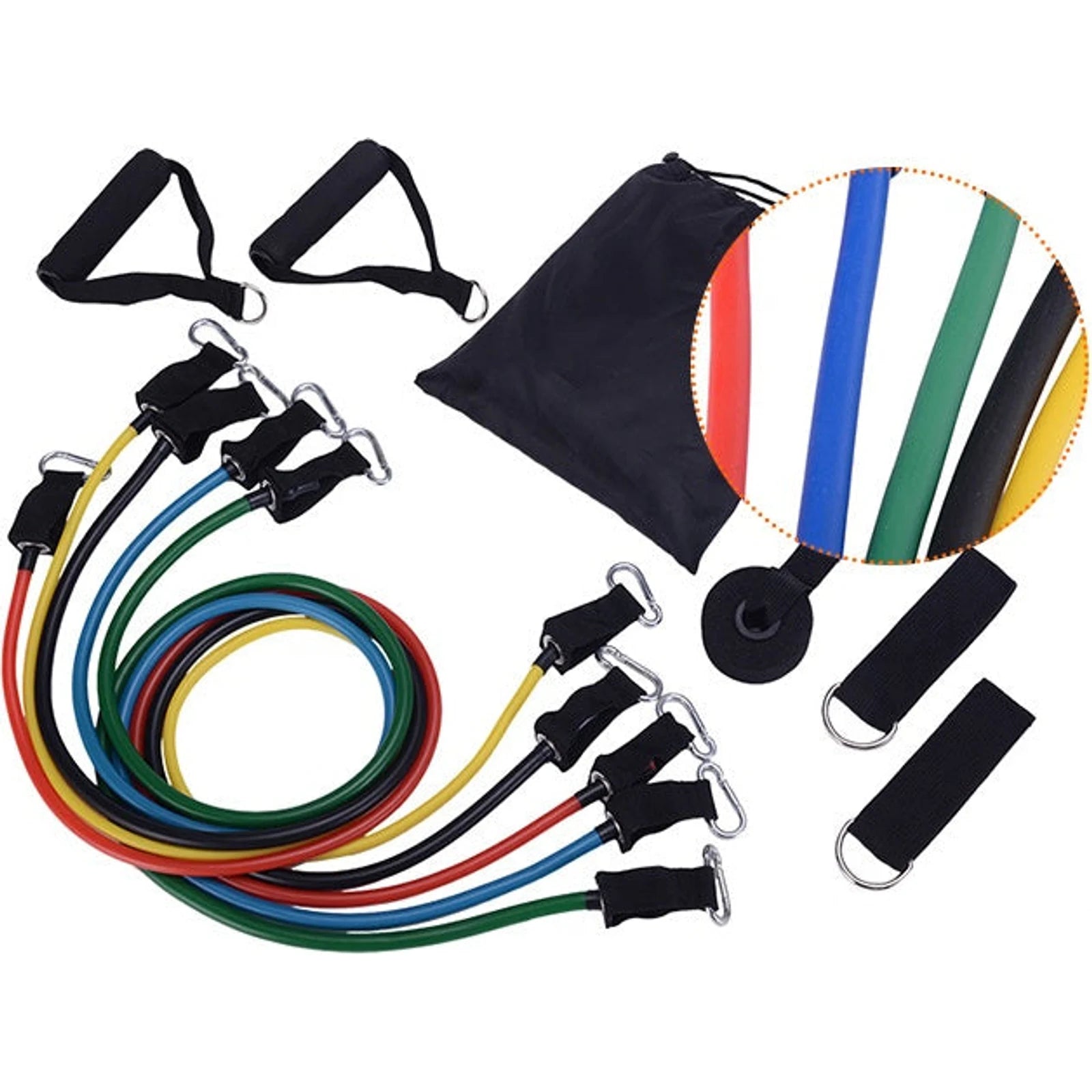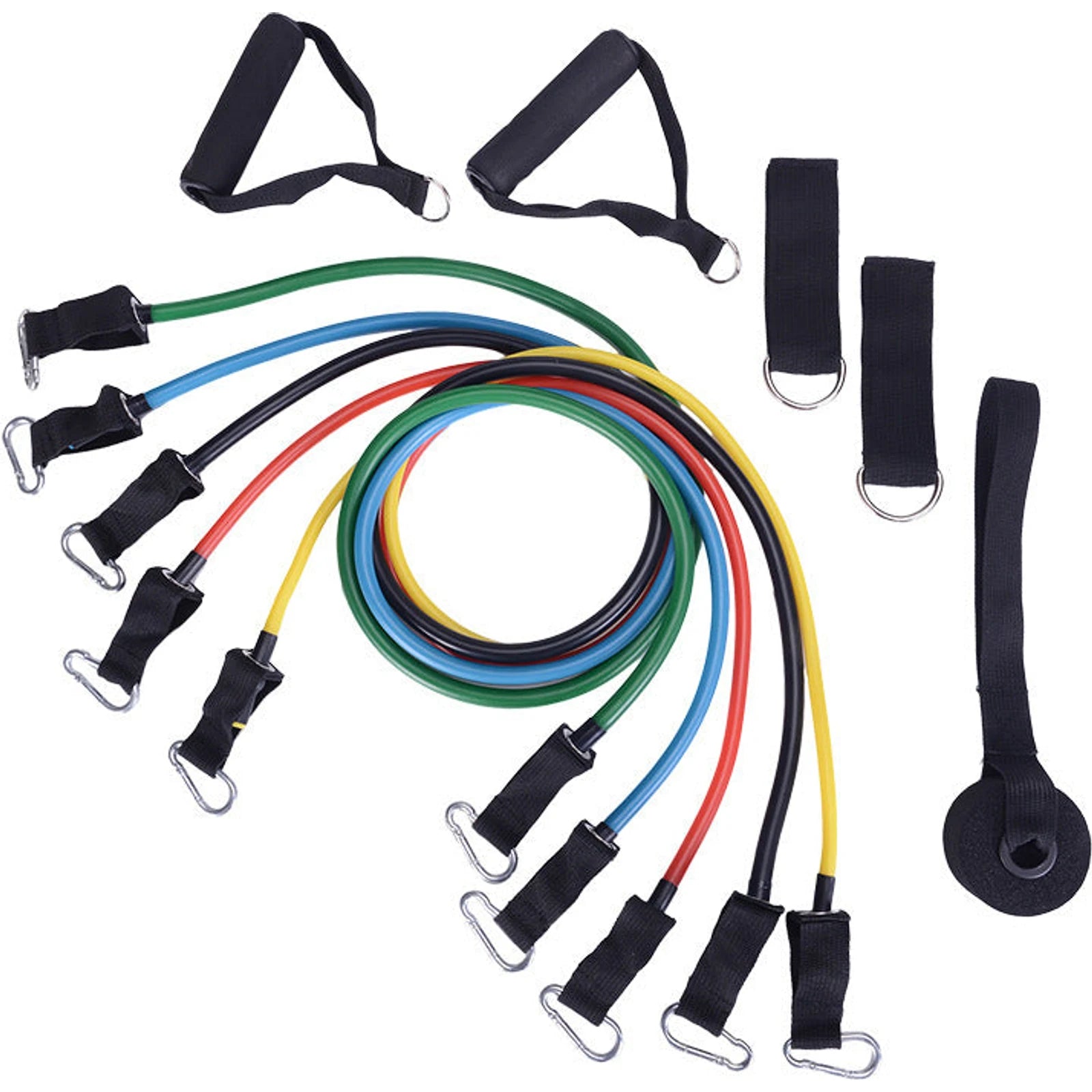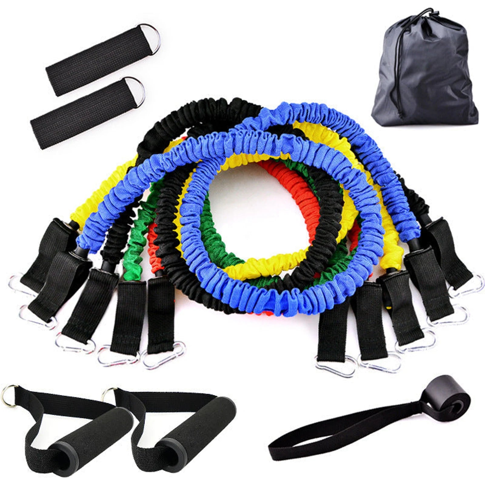 5 * elastic bands: black (30 lbs), blue (25 lbs), red (20 lbs), green (15 lbs), yellow (10 lbs)